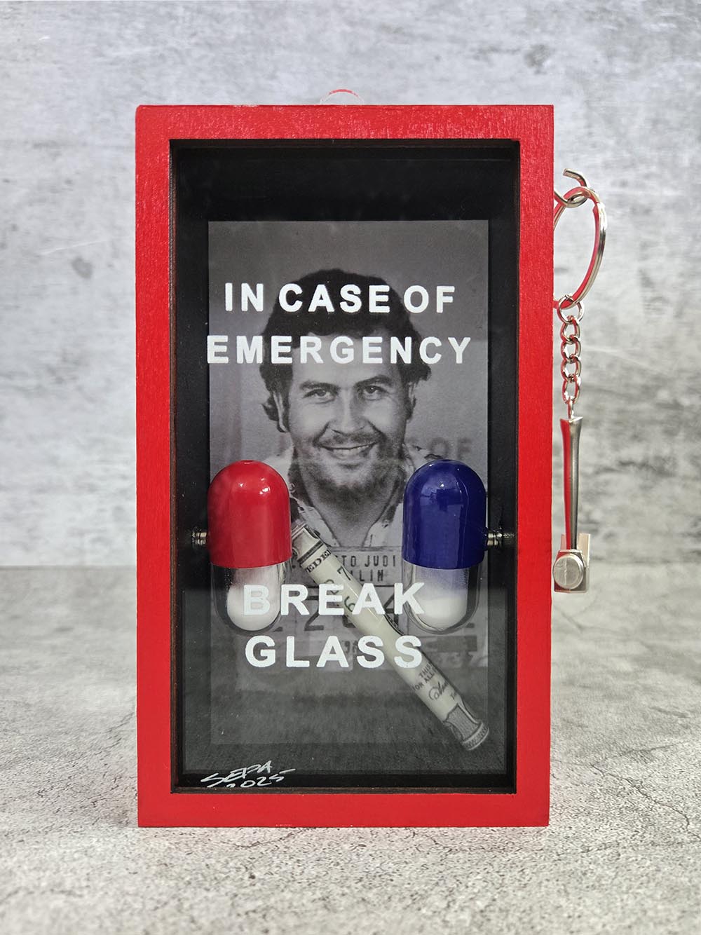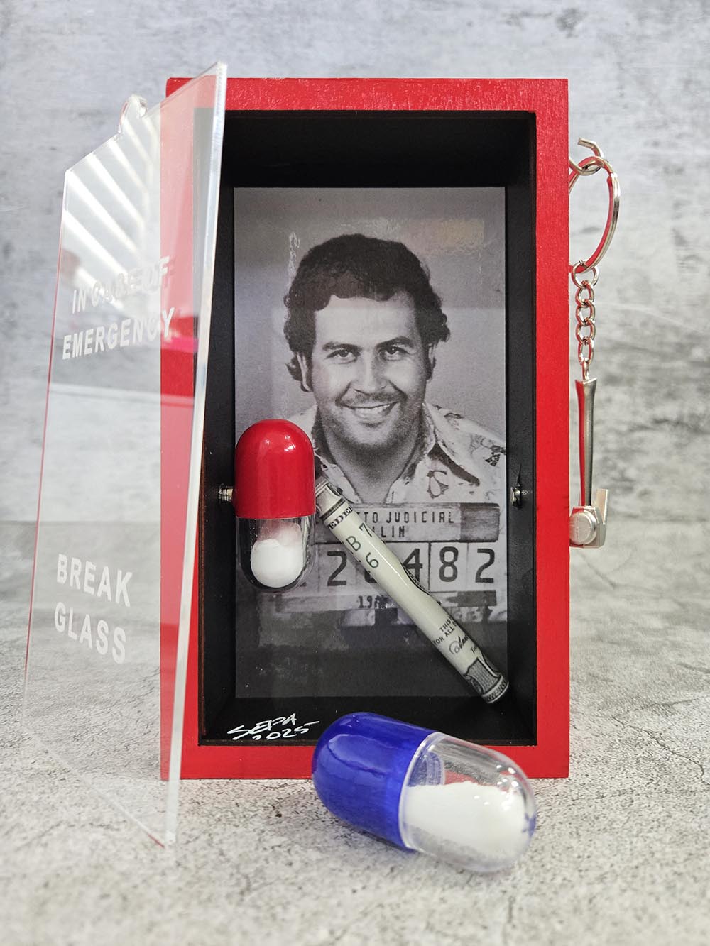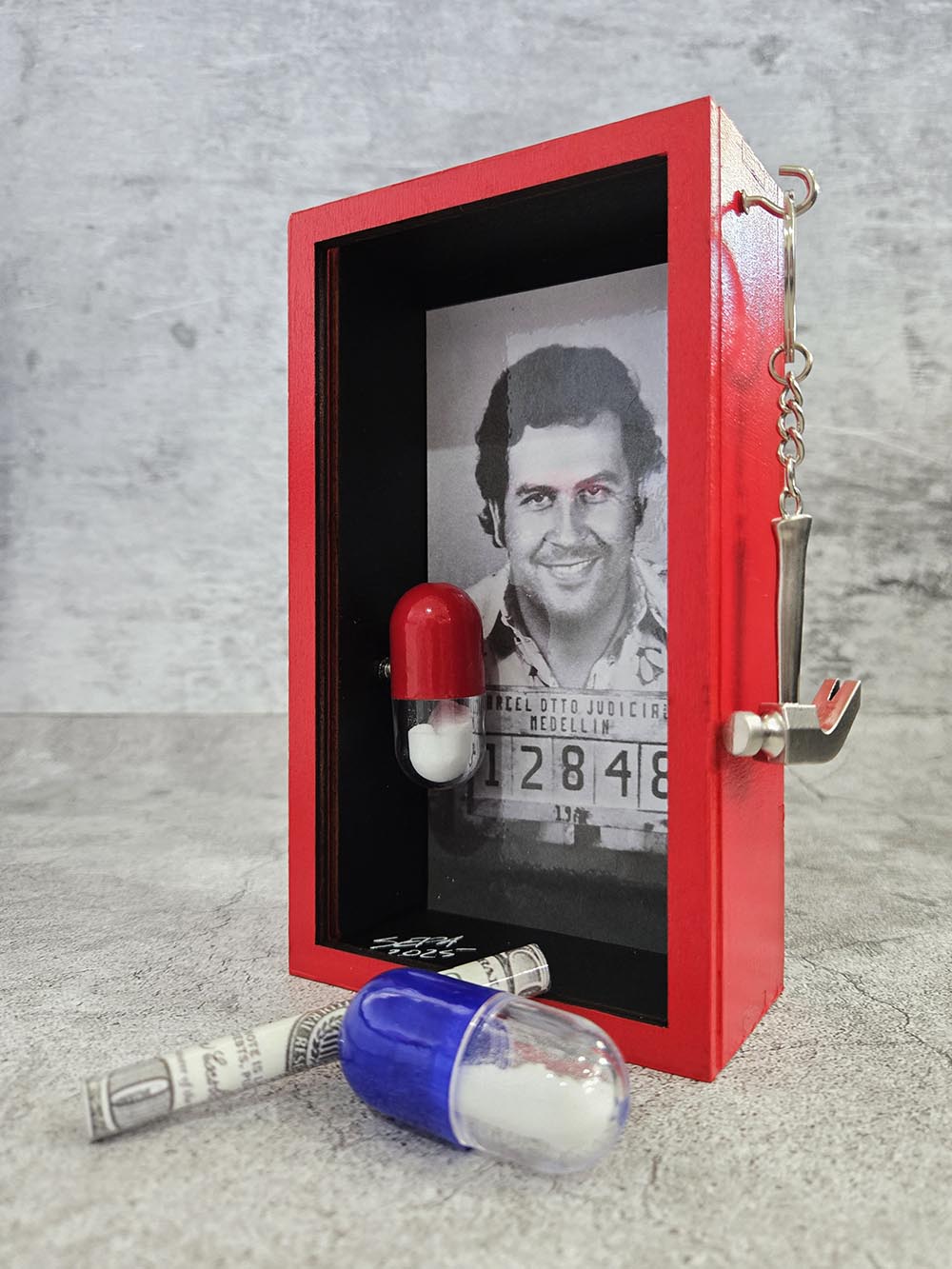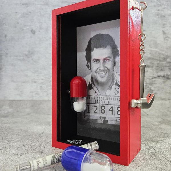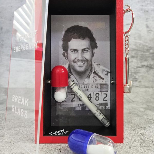 Approx Size: 10.5 x 17.5 x 5cm (WxHxD) Title Pill'n In The Name Of - Narco Size Approx Size: 10.5 x 17.5 x 5cm (WxHxD) Medium Wood, PVC, Paper, Paint Year 2025 For Sale https://koolkreamery.com/collections/pilln-in-the-name-of-narco/